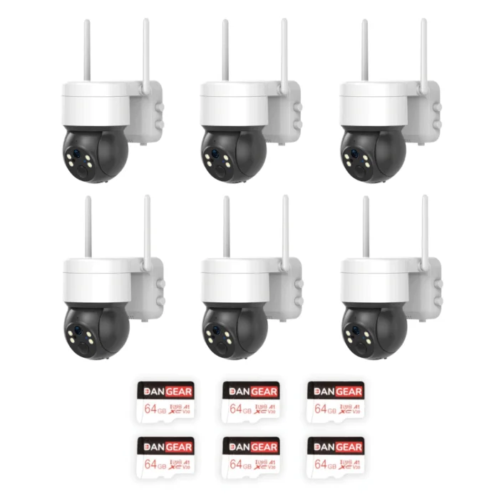 DanGears 4MP WiFi PTZ overvågningskamera med autotracking mega pakke er top-pakken til dig, der vil have omfattende, intelligent og trådløs overvågning af større områder – helt uden besvær med kabler. De seks 4MP WiFi PTZ batterikameraer leverer skarp 2K-opløsning med naturtro farver, pan/tilt-funktion til bred dækning og klar nightvision, både i klassisk sort/hvid og i fuld farve ved hjælp af de indbyggede LED-lys. Denne 4MP WiFi PTZ overvågningskamera med autotracking mega pakke er ideel til større ejendomme, virksomheder, gårdspladser, indkørsler, lagerbygninger og andre steder, hvor du vil have maksimal dækning rundt om hele området.