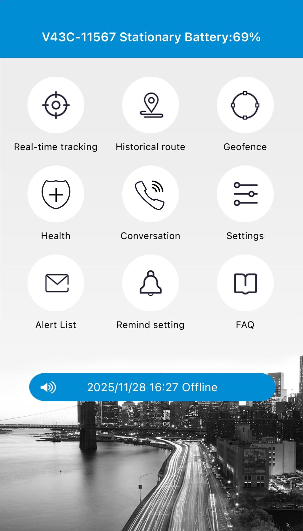 Ved at trykke på Alert List (alarmliste) kan man få overblik og dato- og tidsstempler for, hvornår trackeren har udløst notifikationer, f.eks. lavt batteri, on/offline, brud på geofence osv.