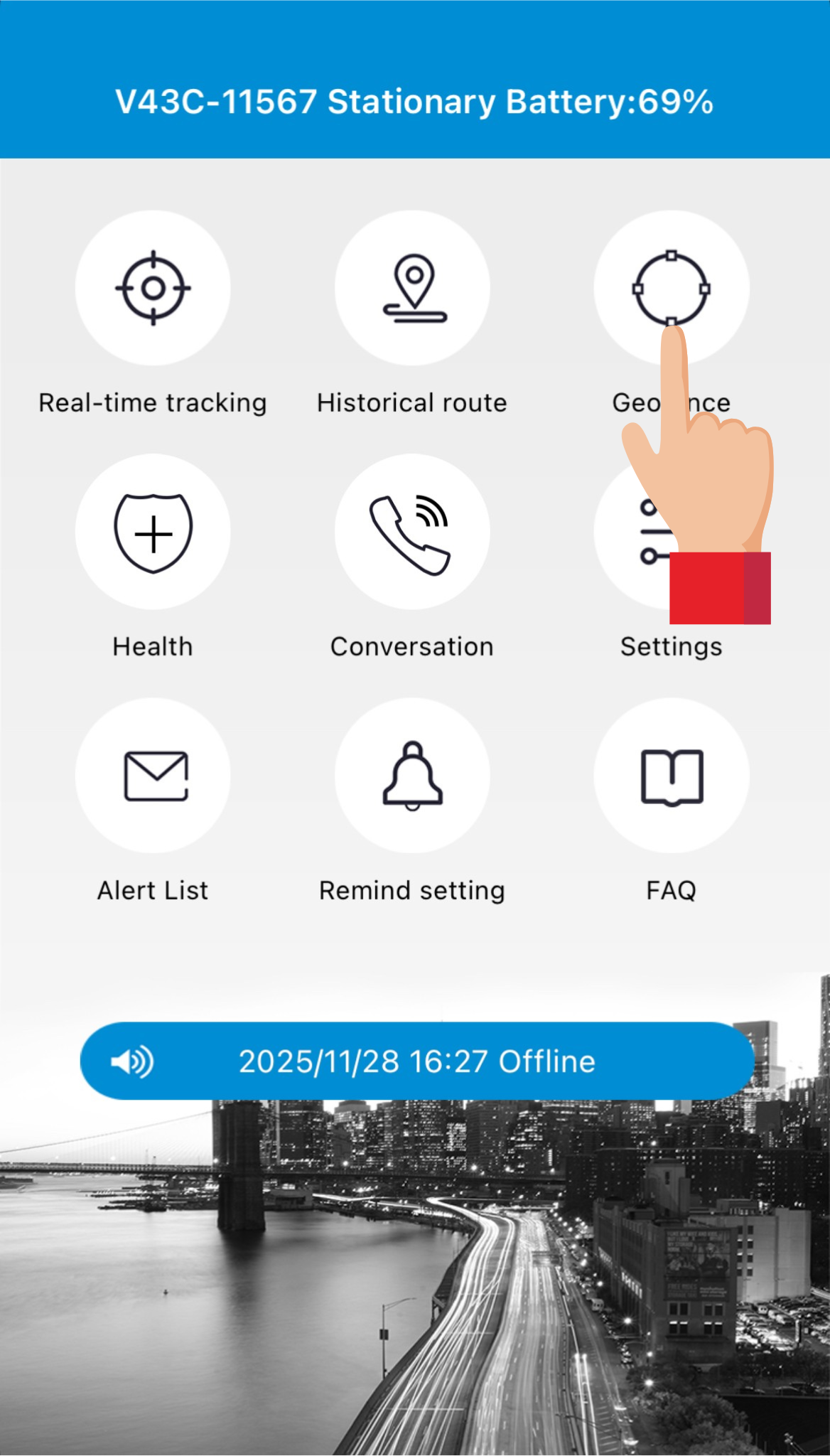 Ved at trykke på Geofence (geografisk hegn) kan man opsætte et område – et “hegn” – og appen vil give en advarsel, hvis enheden bevæger sig ind i, eller ud fra det markerede område.