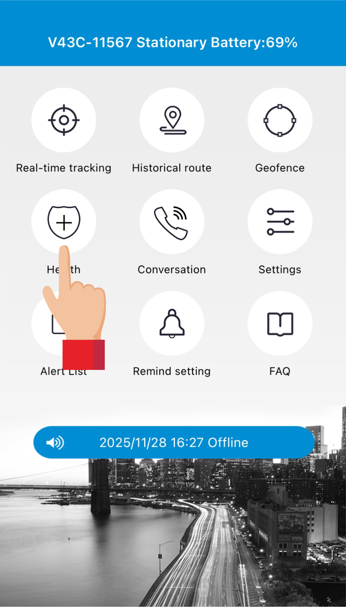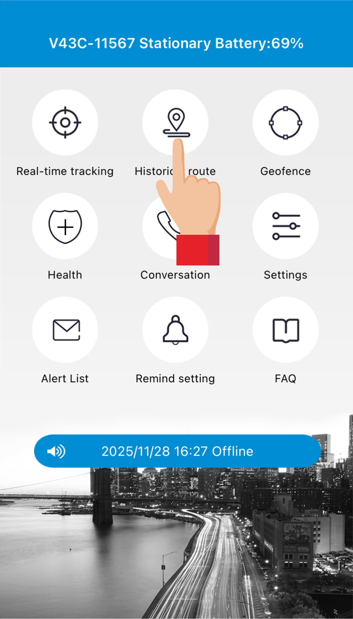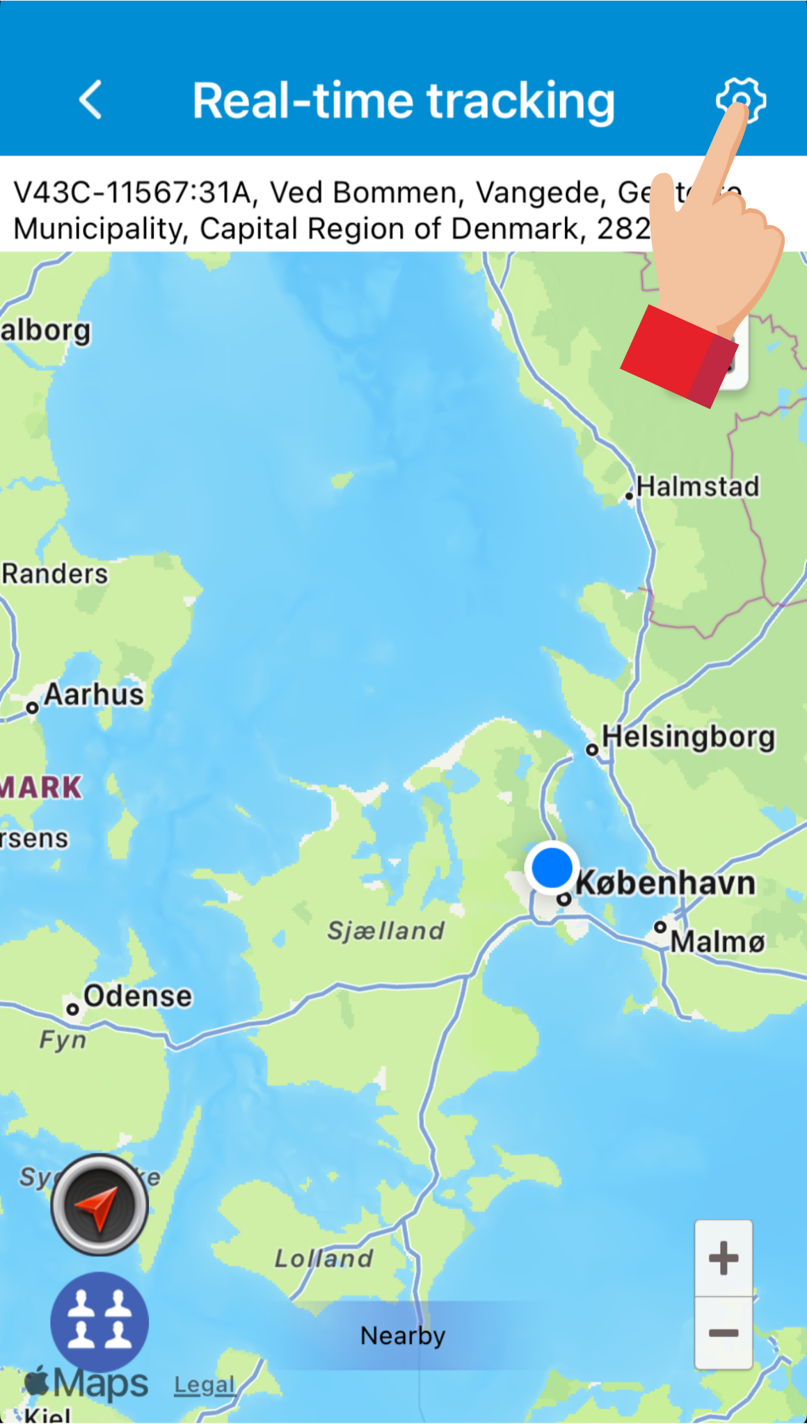 Ved at trykke på Real-time tracking (sporing i realtid) kan man se trackerens aktuelle placering.