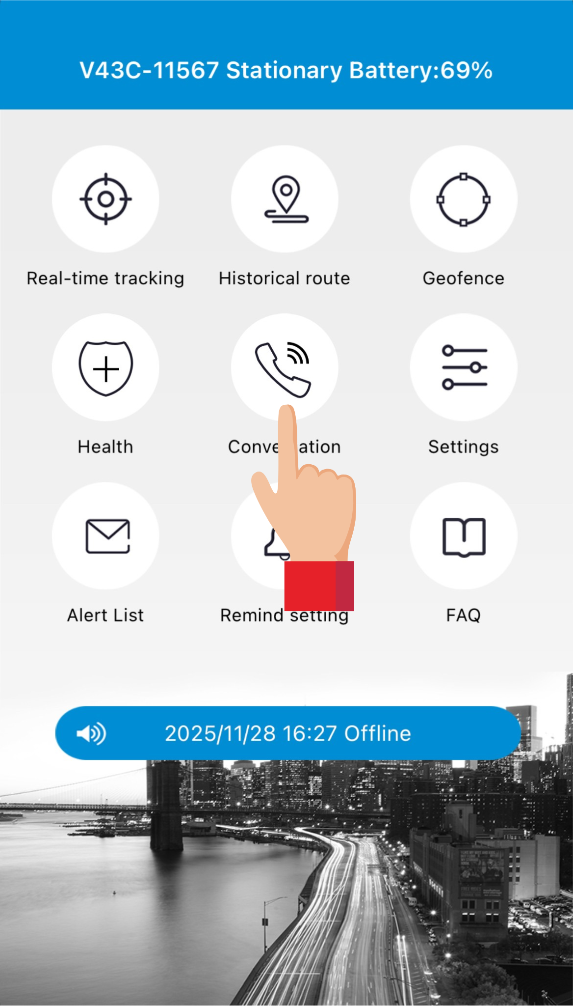 Ved at trykke på Conversation (samtale) kan man foretage opkald direkte til trackeren, hvis den eksempelvis er forlagt.