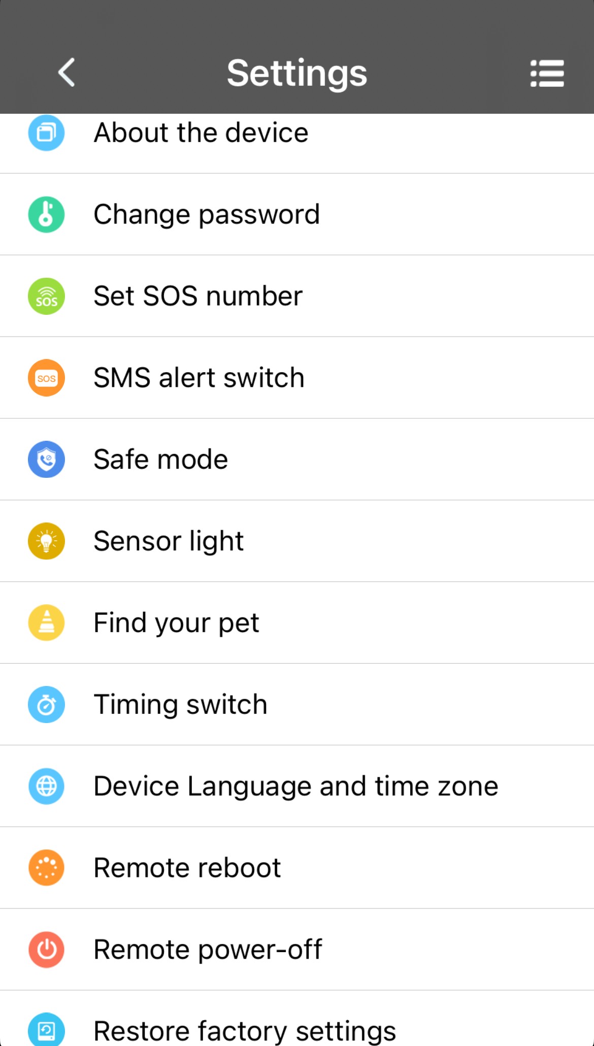- Under Indstillinger kan man bl.a. skifte adgangskoden til log in, se oplysninger om enhed, slå forskellige funktioner til eller fra, indstille sensorlys, finde kæledyret osv.