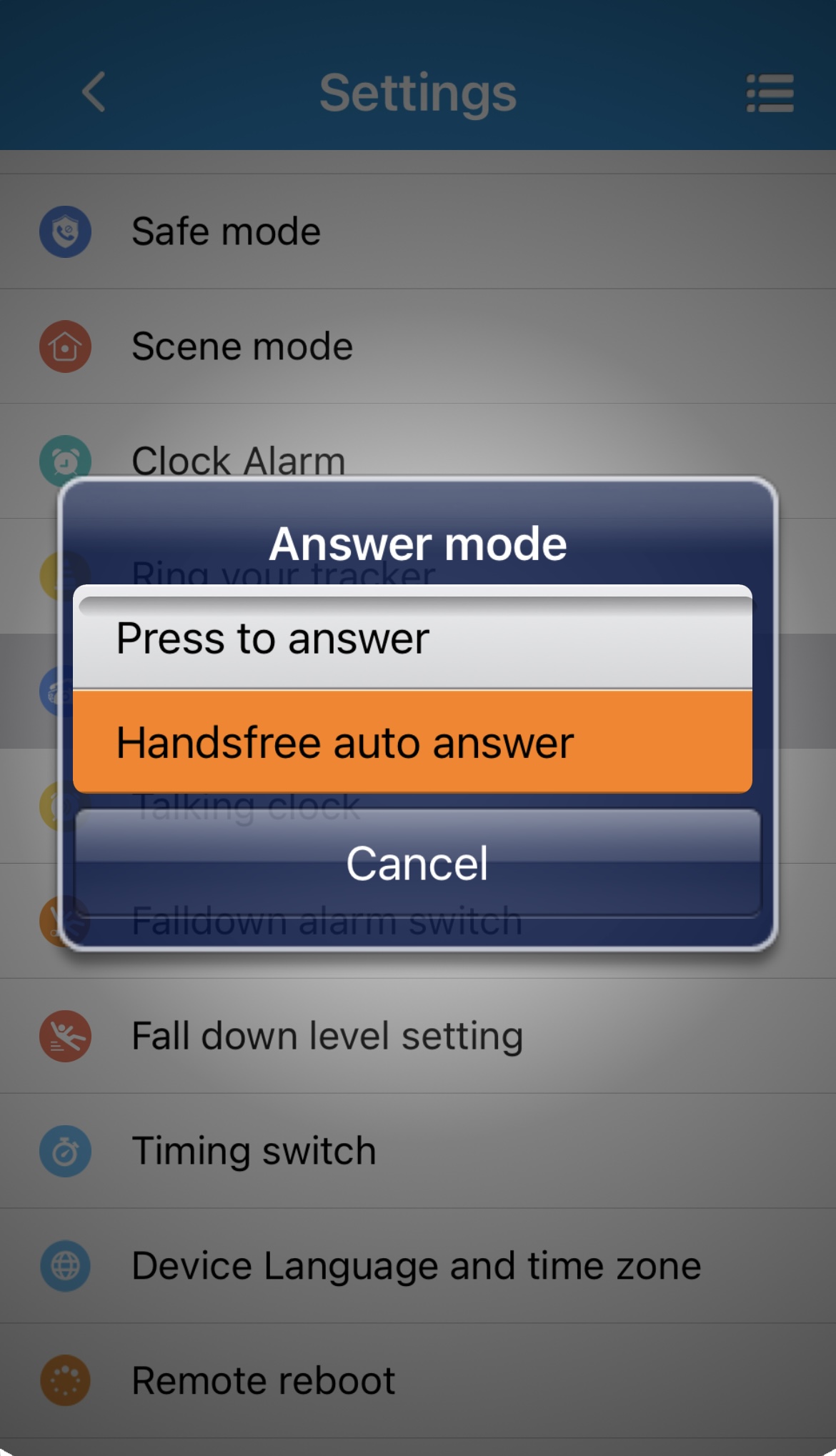 Ved at trykke på Answer mode (besvarelsestilstand) vælger man, om der ønskes automatisk besvarelse ved indgående opkald, eller om man manuelt skal klikke på den grønne mikrofonknap for at besvare det.
