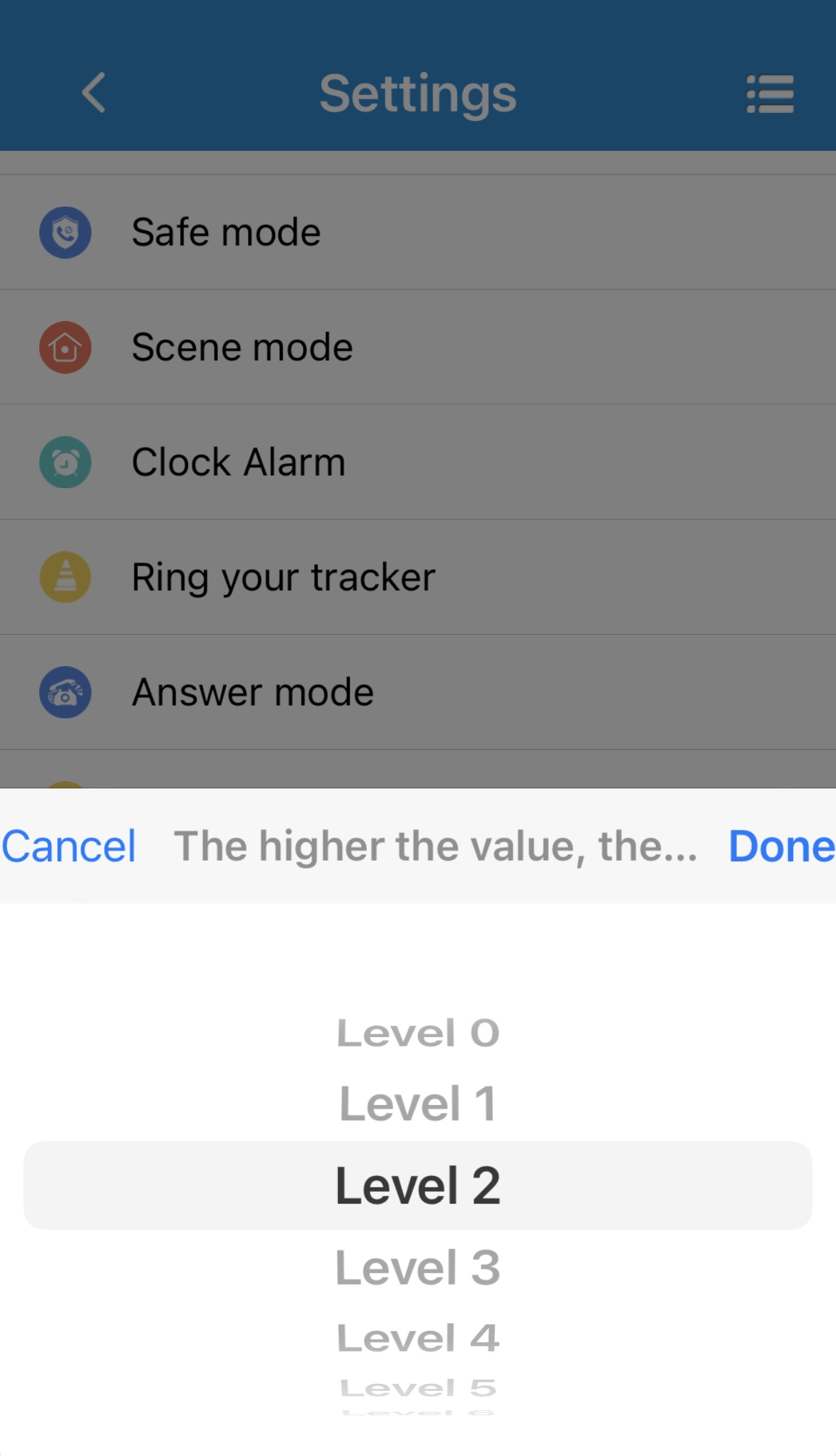 Level 1 er mest følsom, og Level 6 er mindst. Som standard anbefales Level 2, alt efter hvor aktiv brugeren er. Level 0 deaktiverer faldalarmen.