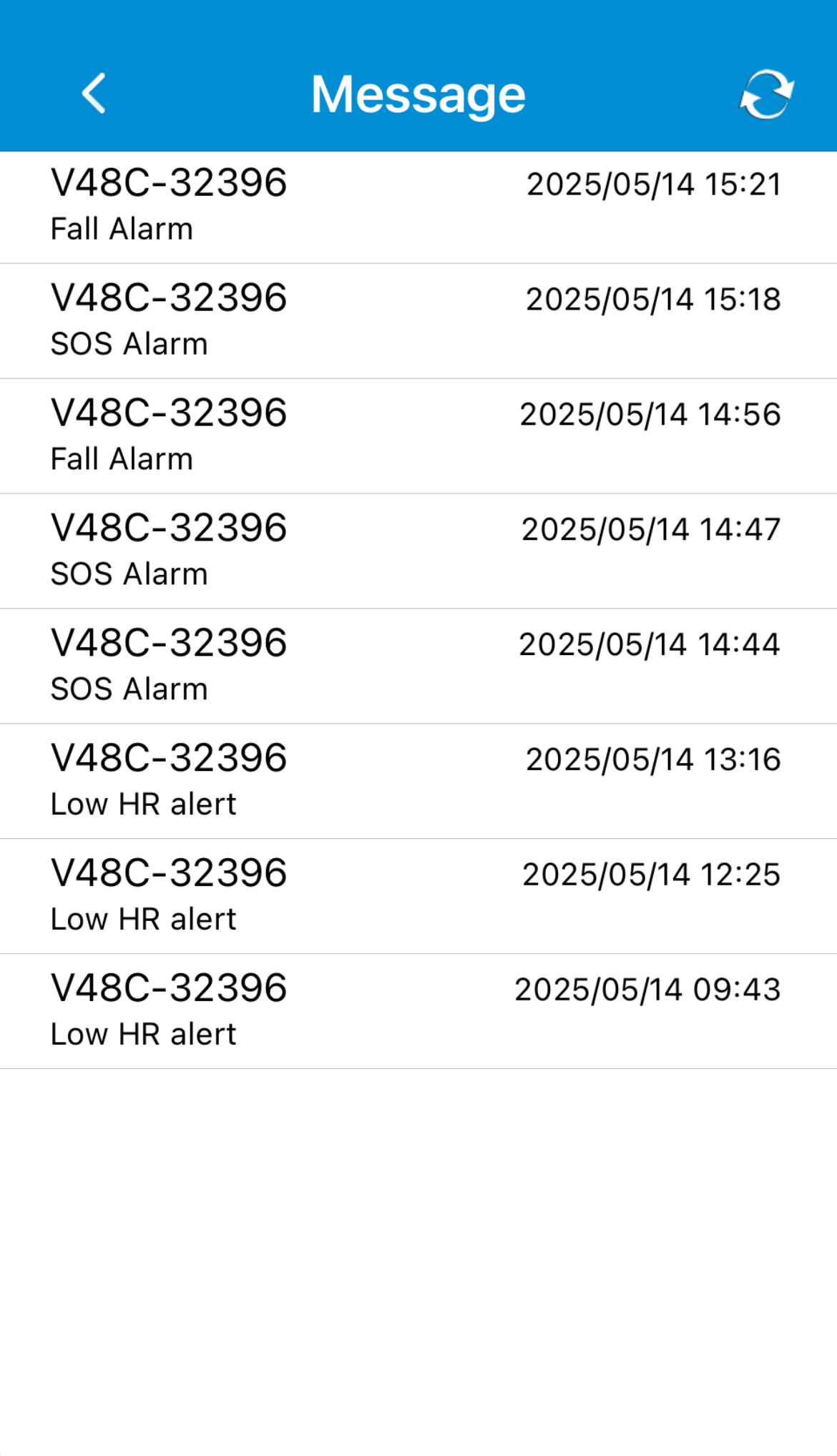 Ved at trykke på Alert List (alarmliste) kan man få overblik og dato- og tidsstempler for, hvornår armbåndet har udløst alarm.
