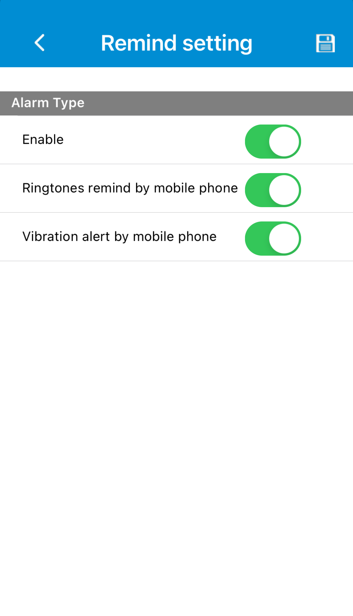 Ved at trykke på Remind setting (indstillinger for påmindelse) får man overblik over muligheder for at slå påmindelser til eller fra.