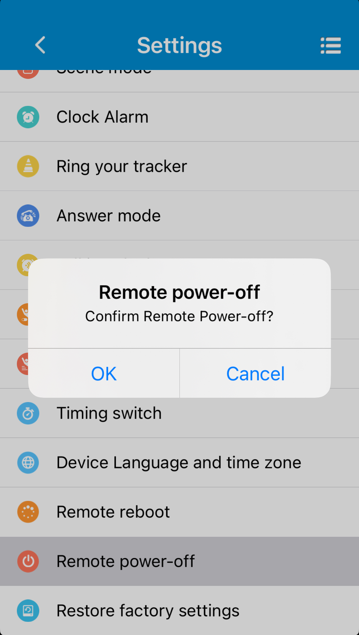 Ved at trykke på Remote power-off (tænd/sluk på afstand) kan man tænde eller slukke armbåndet fra appen, uden at gøre noget på selve armbåndet.