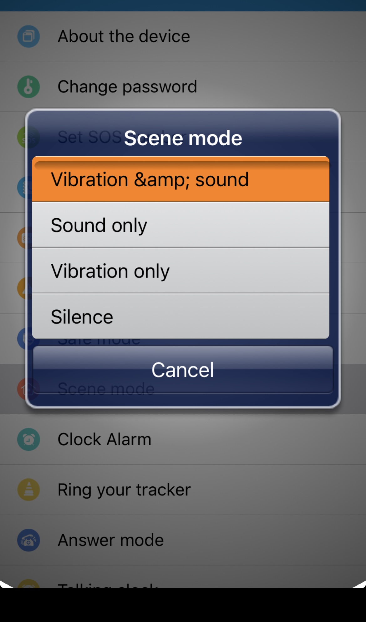 Ved at trykke på Scene mode (scenetilstand) kan man indstille, hvordan armbåndet skal give besked ved indgående opkald – f.eks. med ringetone, vibration eller begge.