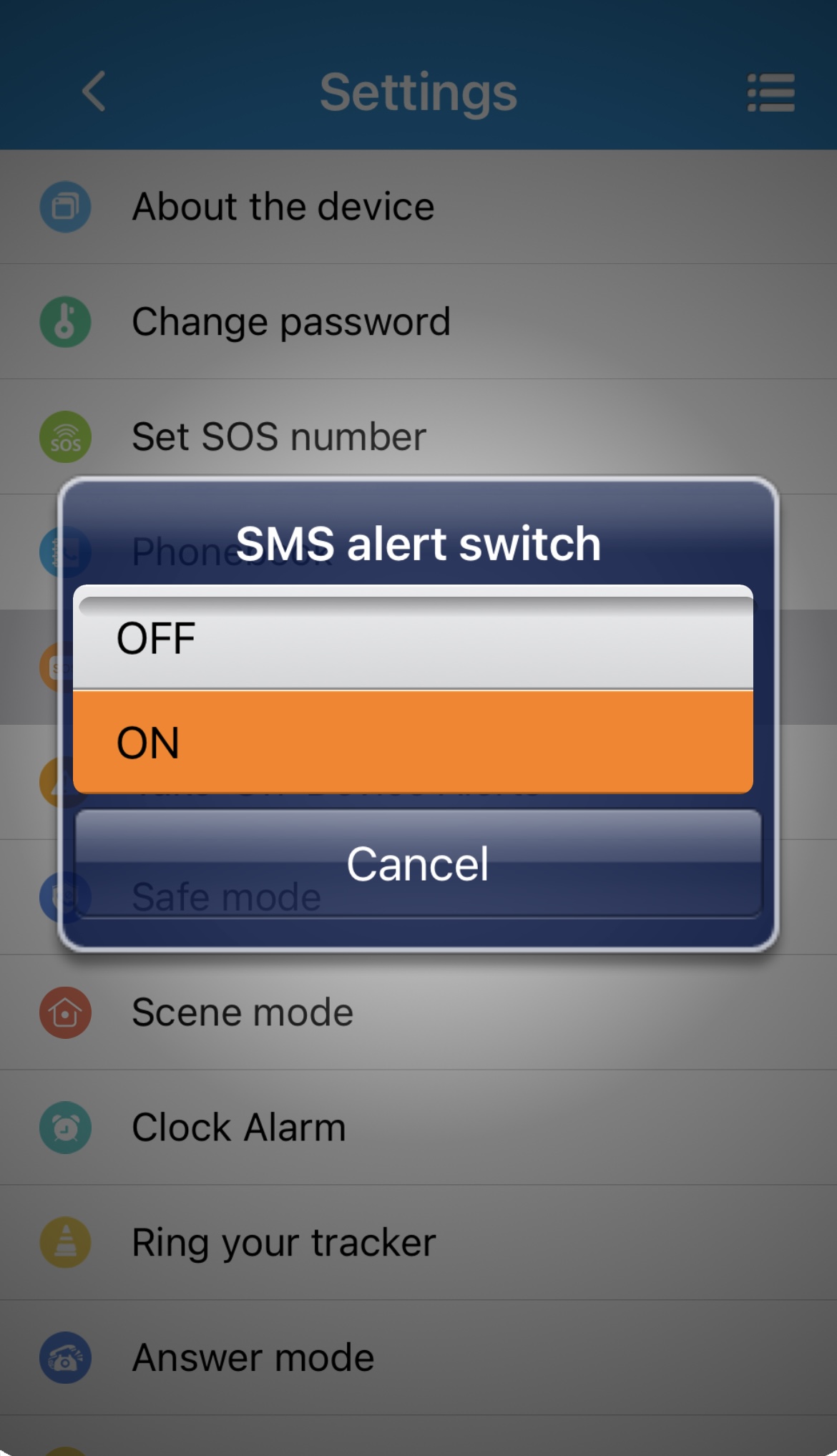 Ved at trykke på SMS alert switch (tænd/sluk for SMS-advarsler) kan der aktiveres eller deaktiveres SMS-advarsler til den primære kontaktperson, hvis SOS-opkald ikke besvares.