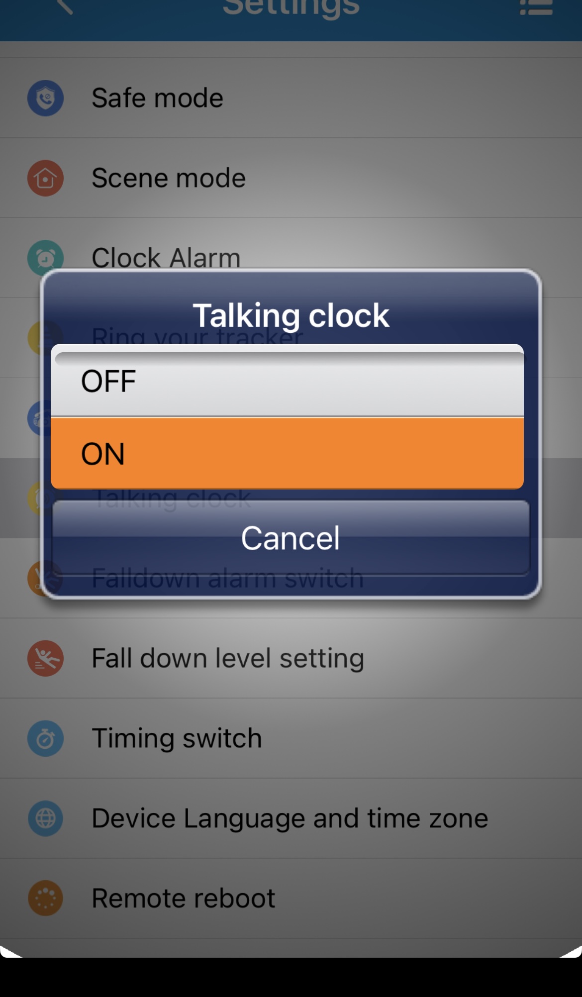 Ved at trykke på Talking clock (talende ur) kan man aktivere eller deaktivere, at armbåndet fortæller klokkeslæt, ved et hurtigt tryk på SOS-knappen.