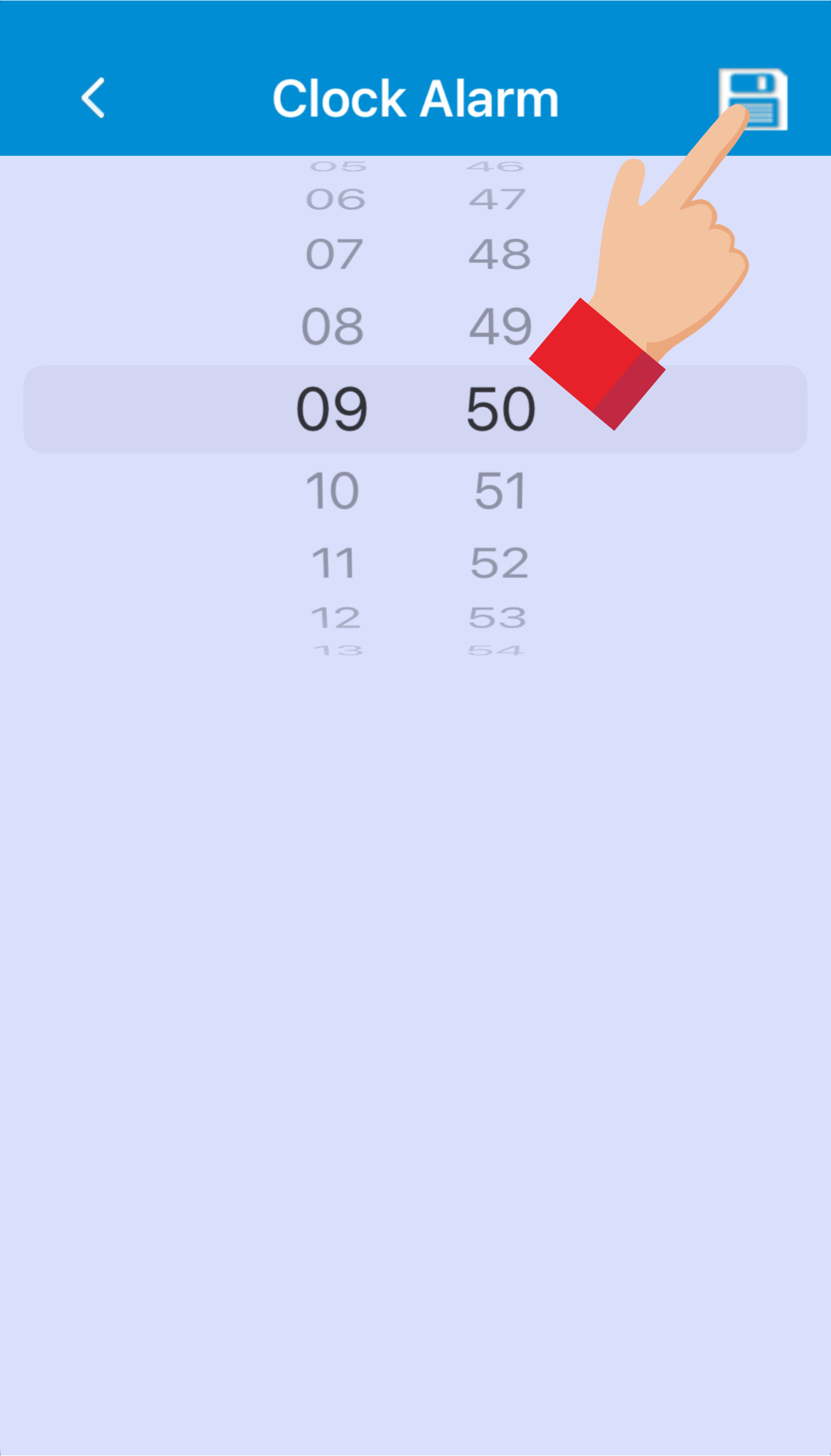 • Ved at klikke på et af felterne, kan man indstille klokkeslæt for alarm. Gem alarmen ved at klikke på ikonet i højre hjørne.