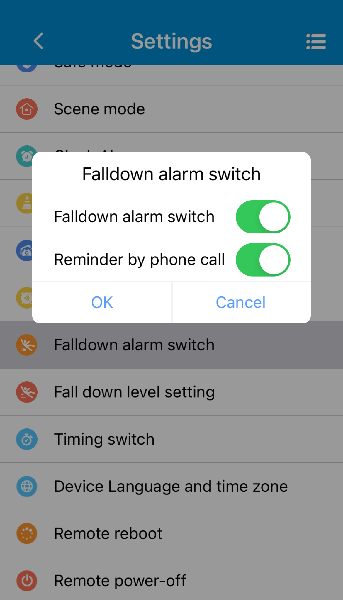 Ved at trykke på Falldown level setting (indstilling for faldfølsomhed) kan man indstille, hvor følsom faldalarmen skal være.