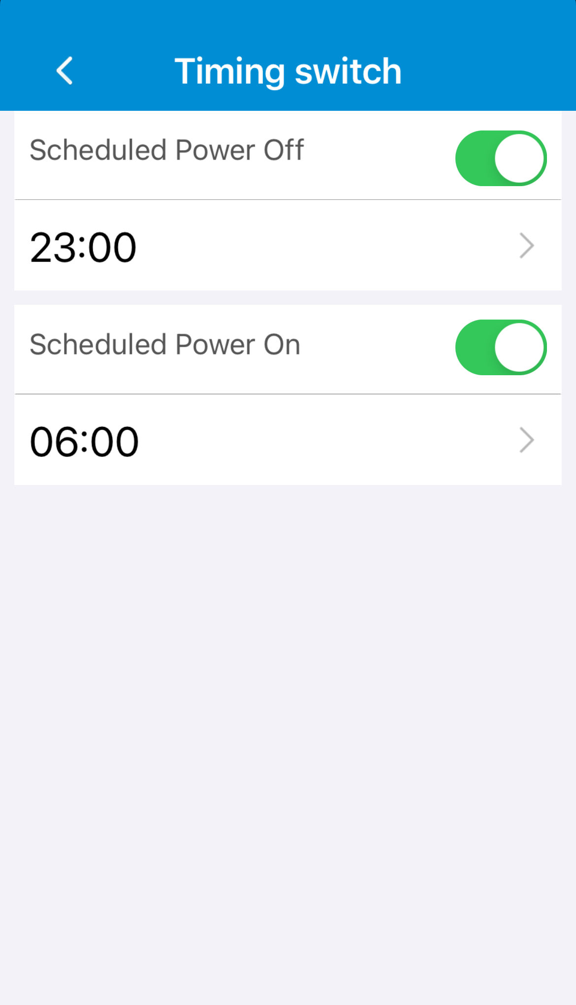 Ved at trykke på Timing switch (tidsindstillet tænd/sluk) kan man indstille, hvornår armbåndet skal slukke og tænde automatisk.