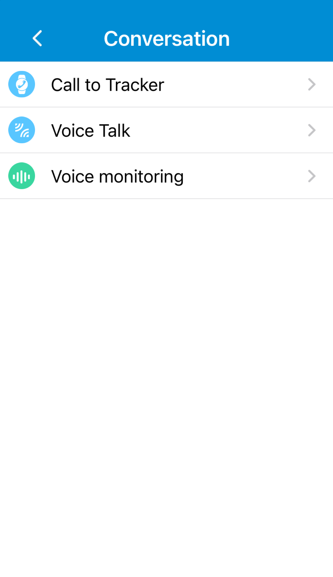 Ved at trykke på Conversation (samtale) kan man foretage opkald direkte til smartwatchet, samt aflytte og sende talebeskeder.