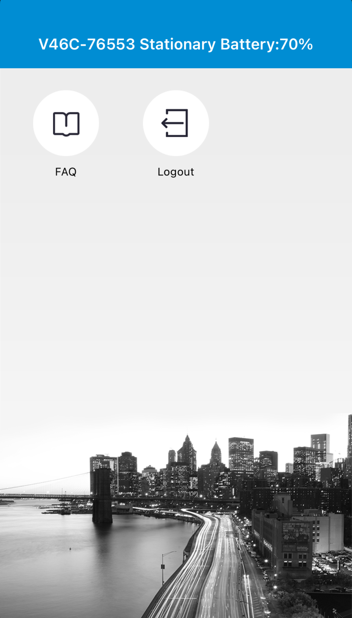 Ved at swipe mod venstre i hovedmenuen, ser du FAQ (ofte stillede spørgsmål) samt Logout (log ud) muligheden.