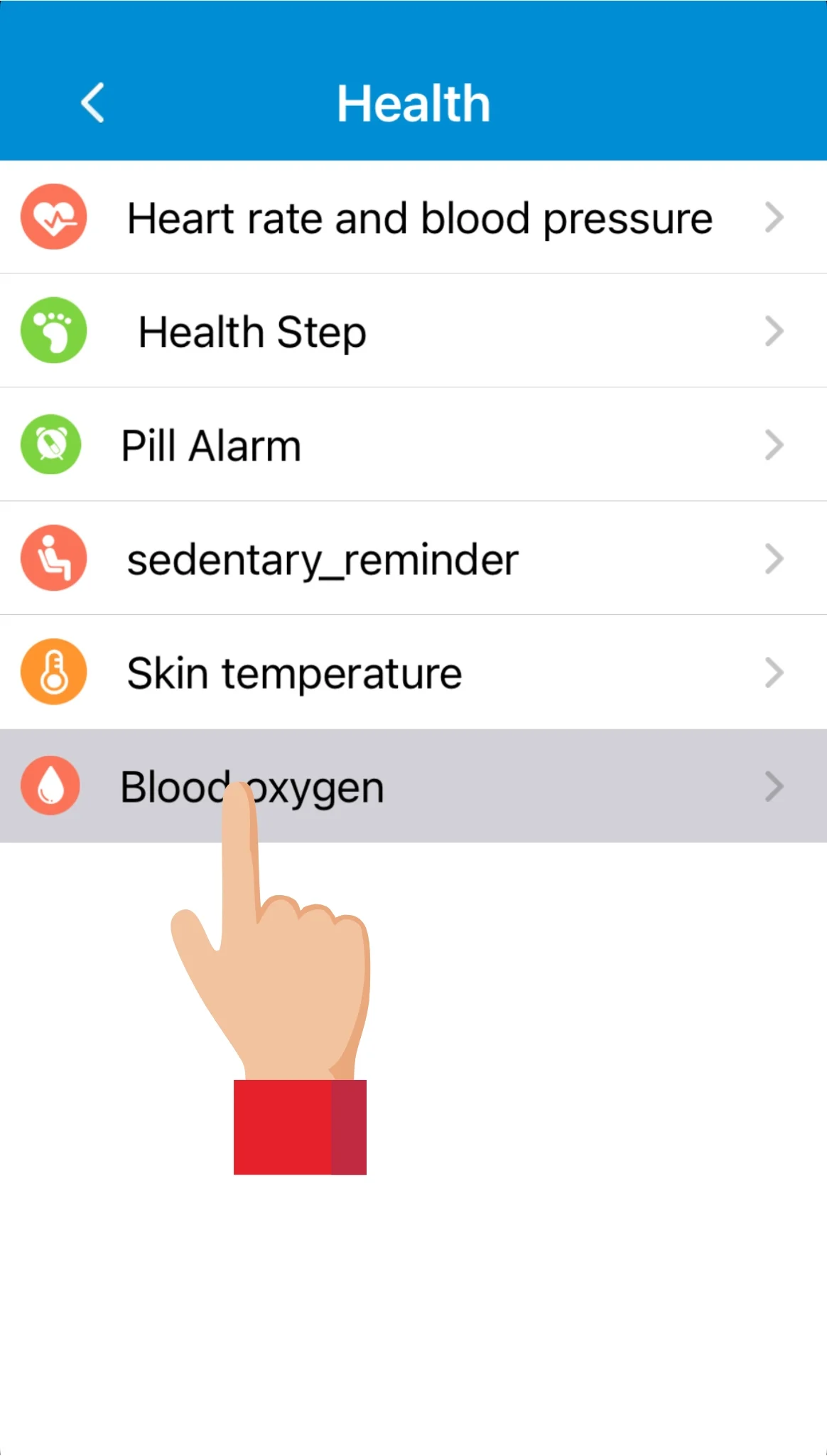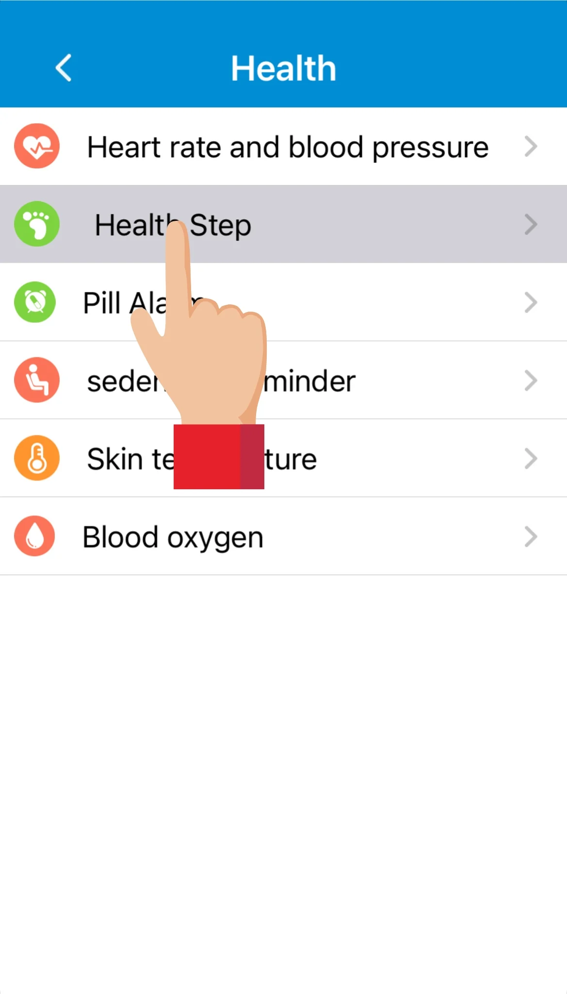 Ved at trykke på Step counting (skridttæller) ser man de daglige antal skridt, der er gået med smartwatchet. Det kan samtidigt ses under Health step (skridttæller) i appen. Smartwatchet har en indbygget gyroskopsensor, som registrerer brugerens skridt. Antallet af skridt opdateres automatisk cirka hvert 10. minut, og fungerer helt uafhængigt af indstillingerne for andre funktioner. For at skridttælleren virker, skal Step switch blot være slået til i appen.
