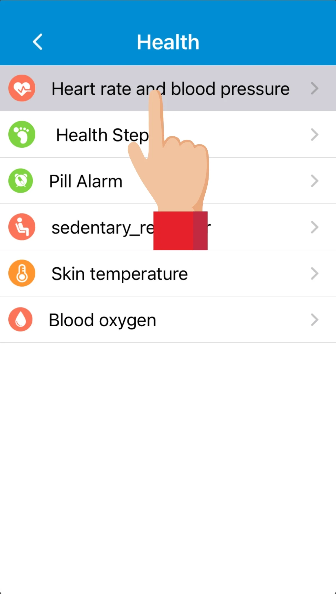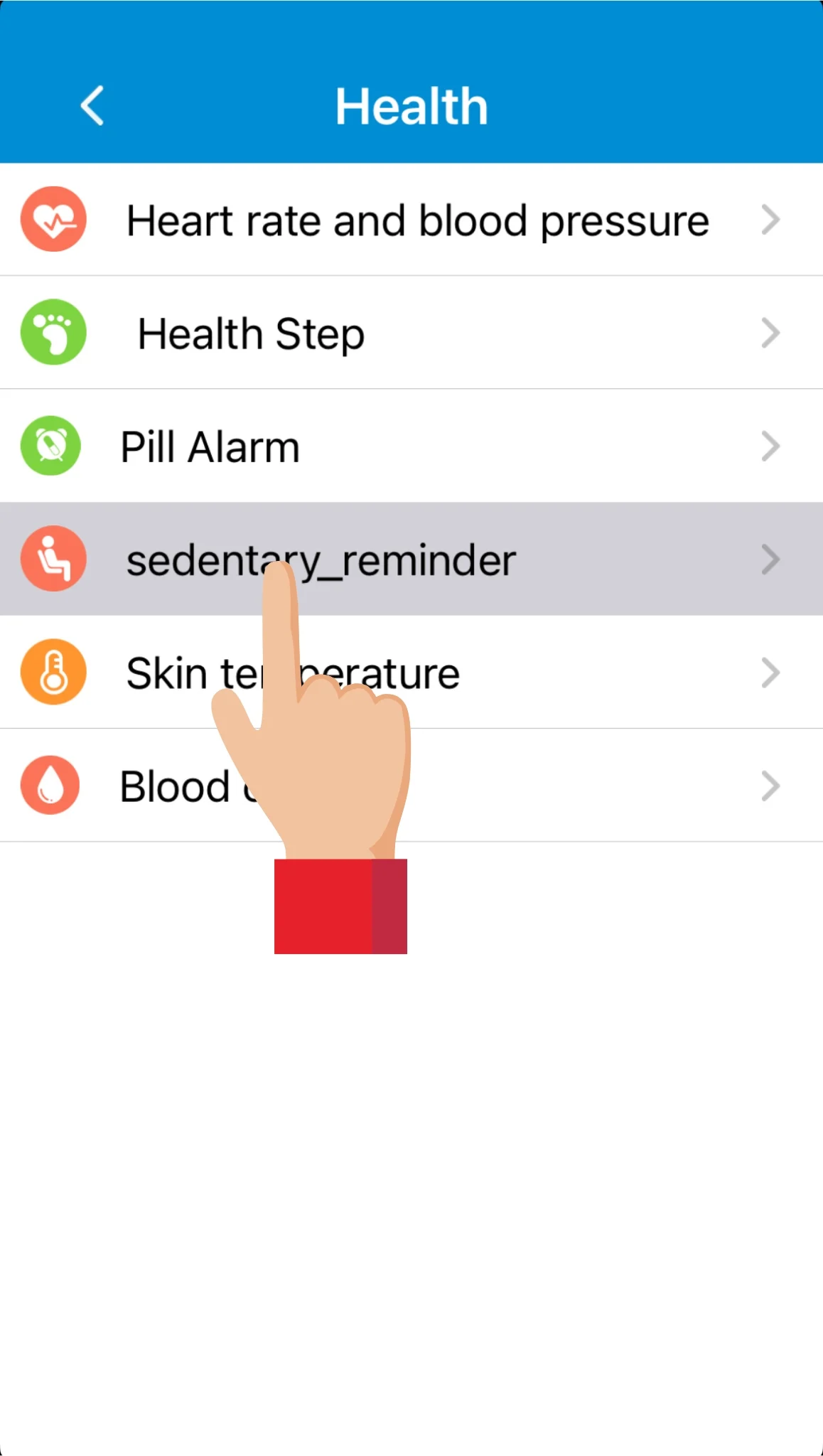 Under Health funktionen kan man trykke på Sedentary reminder (påmindelse om inaktivtet/stillesiddende), og indstille påmindelser om inaktivitet/stillesiddende tidspunkter efter minut eller tidsrum.