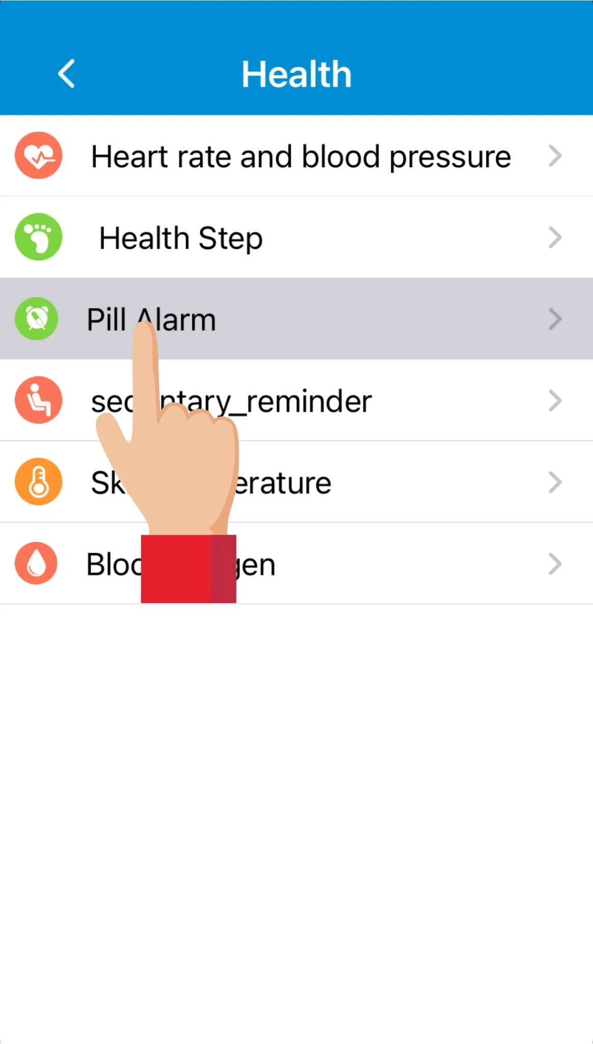 Under Health funktionen kan man trykke på Pill Alarm (medicinpåmindelse), og indstille op til tre forskellige påmindelser, efter brugerens behov.