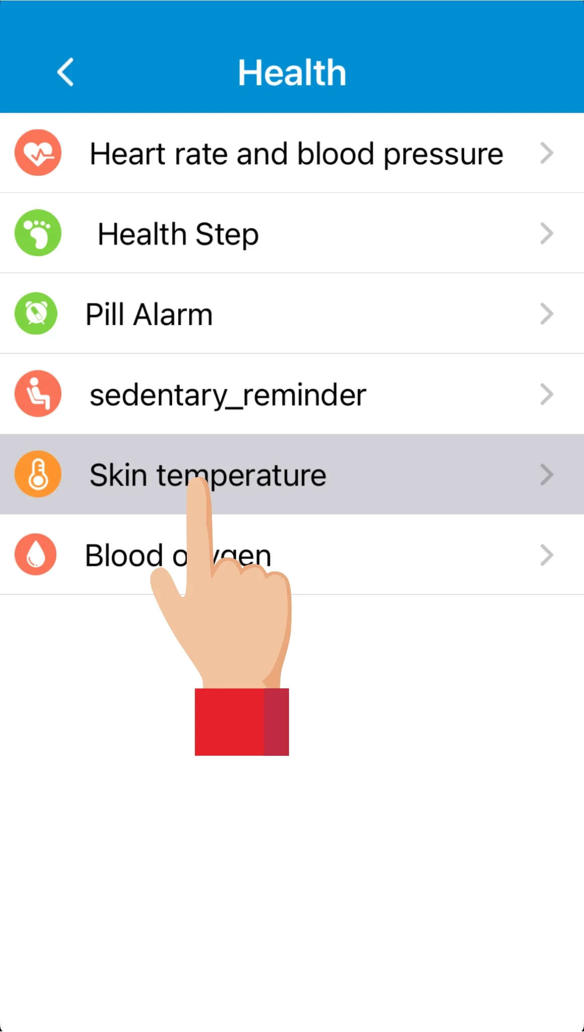 Ved at trykke på Skin temperature (kropstemperatur), kan man aflæse temperatur-måling fra brugerens håndled.