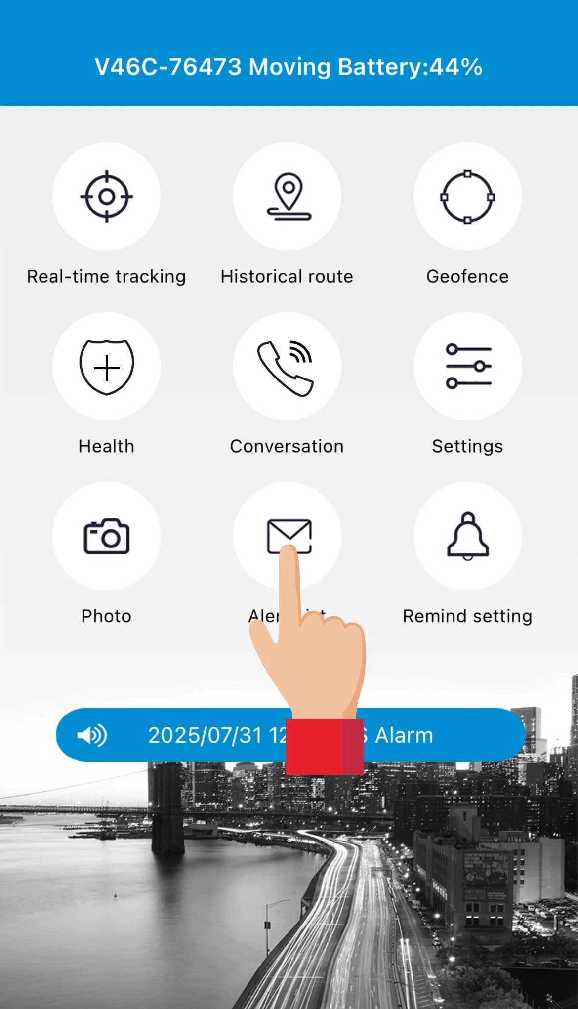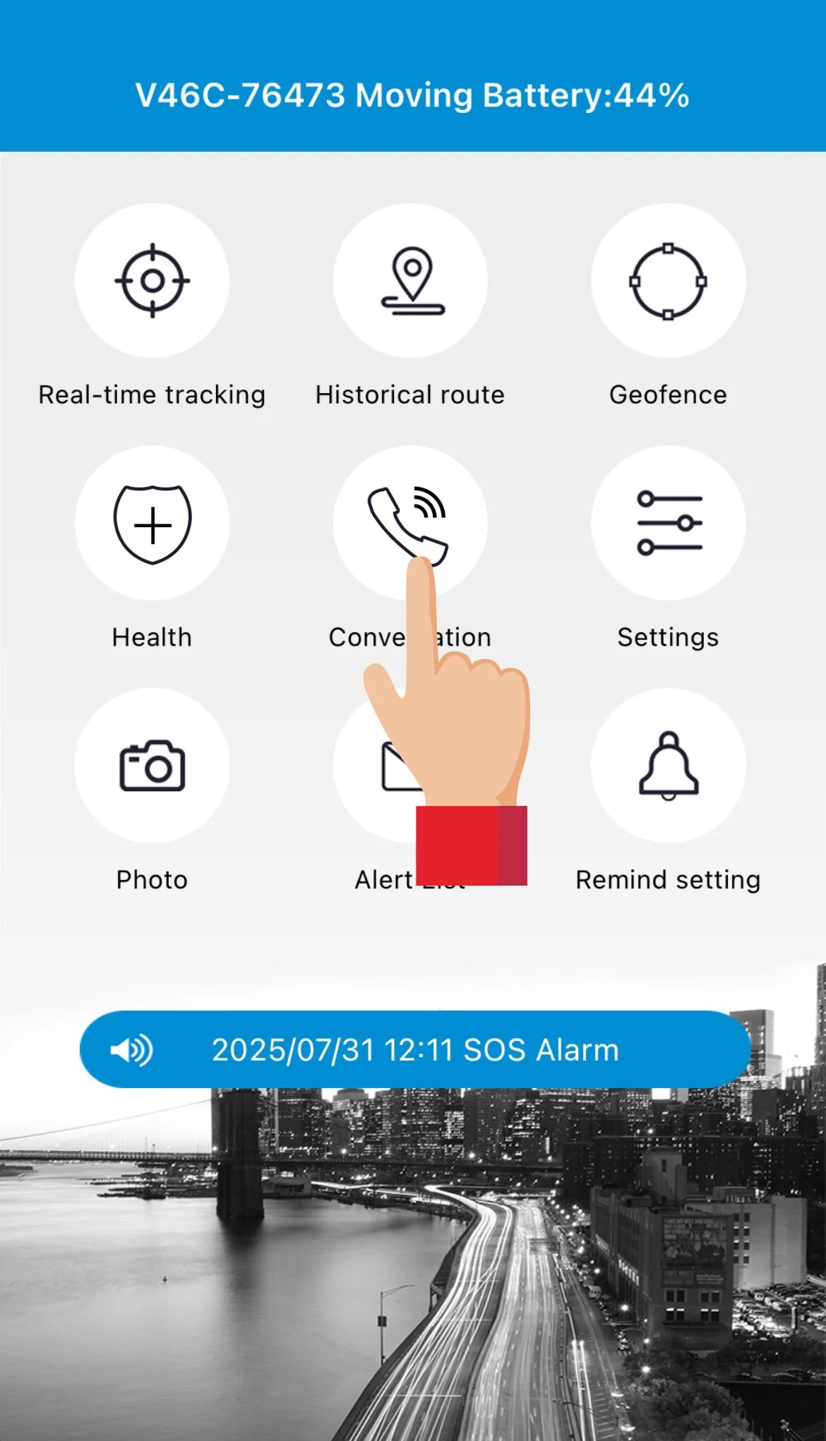 Ved at trykke på Call to tracker (opkald til enheden) kan pårørende ringe til uret, og tale direkte med brugeren via deres smartphone.