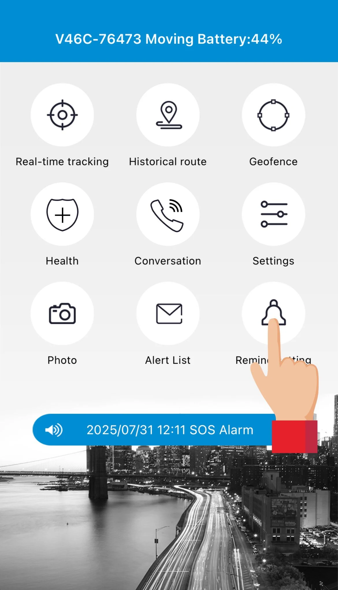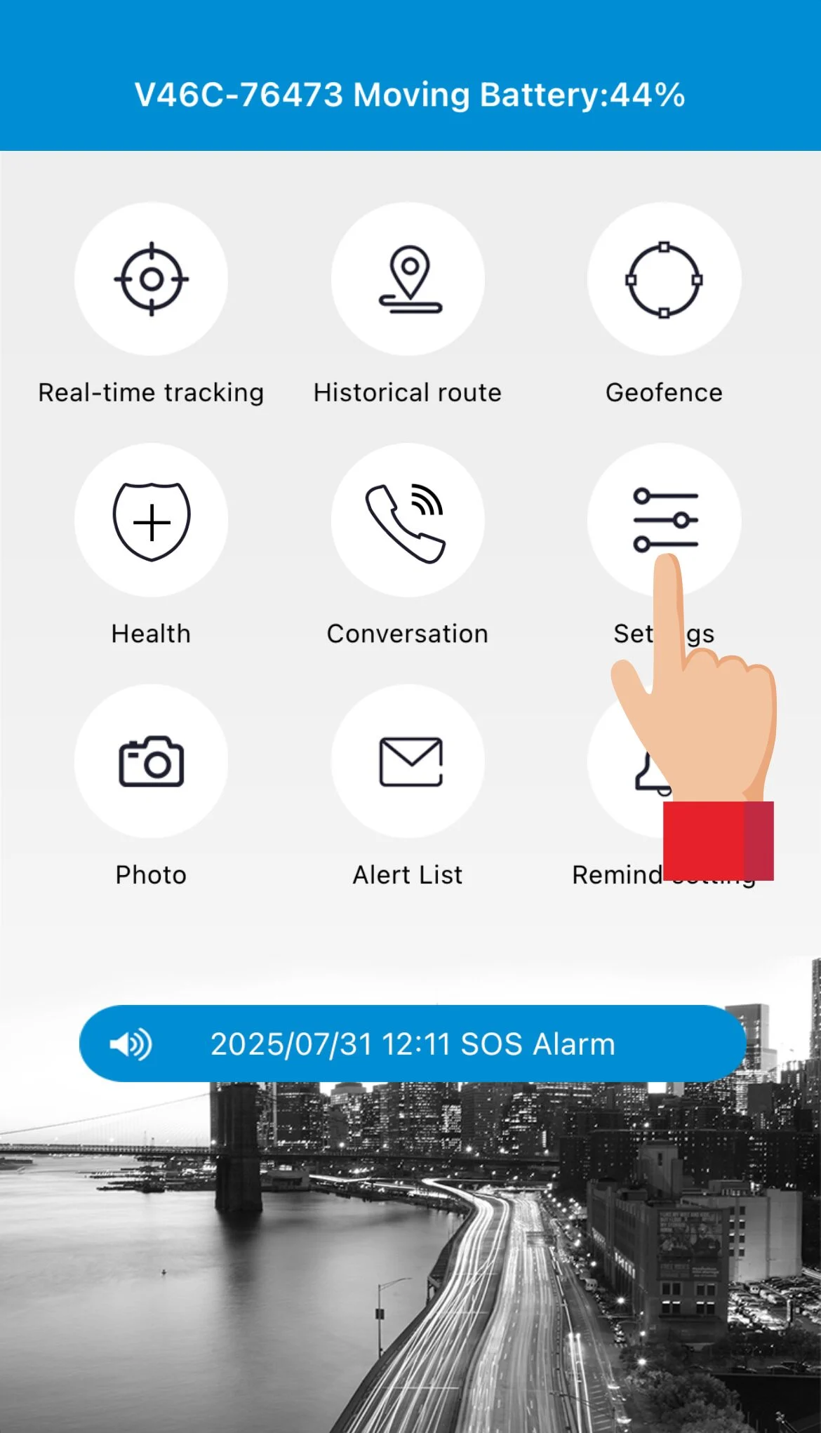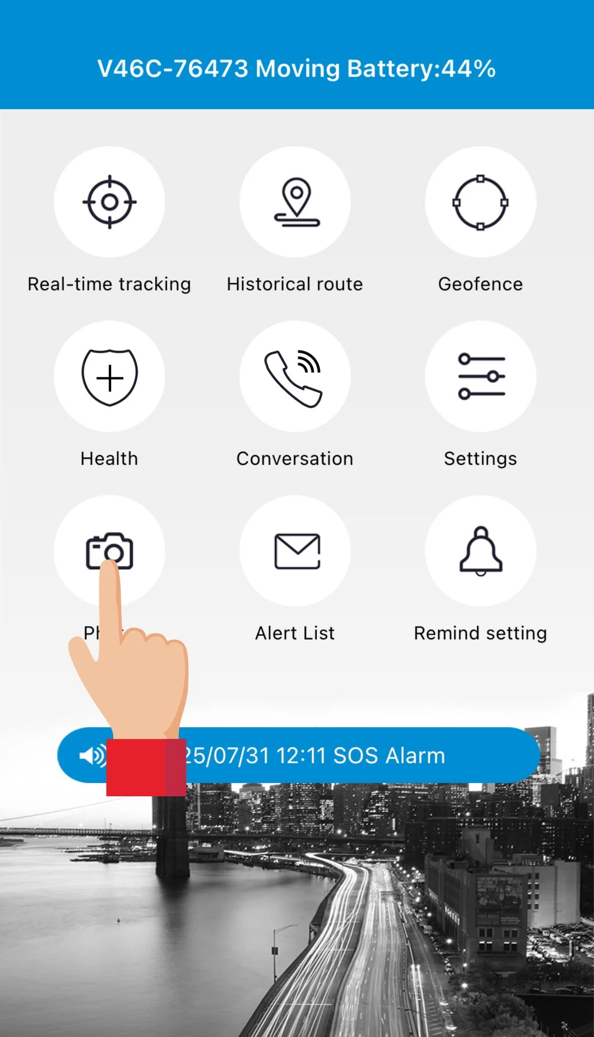 - Ved at holde SOS-knappen på smartwatchet inde i ca. 5 sekunder, som på billedet nedenfor, ringer man op til de 3 SOS-numre man har angivet i indstillinger i AnyTracking (se afsnittet Indstil SOS numre), efter rækkefølge.